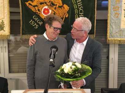 Im weiteren Verlauf wurden dem Pensionär dann noch einige Präsente überreicht, u.a. eine von der Tischlerei Schöning handgefertigte „Schützenbraut“ in Edelholzoptik mit Gravur, die große Ehrennadel der 1. Kompanie in Silber, ein gerahmtes Erinnerungsfoto vom letzten Schützenfest und ein Blumenbukett für seine liebe Frau Beate.